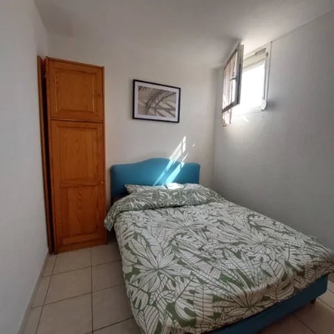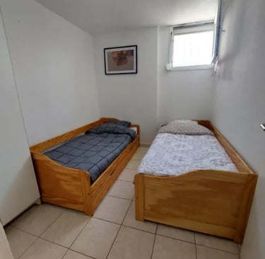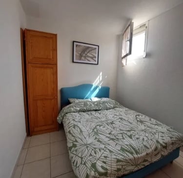 L'appartement se compose de deux chambres : la première est équipée d'un lit double de 140 cm, idéale pour des nuits reposantes, et la seconde dispose de deux lits simples de 90 cm, parfaite pour accueillir des enfants ou des amis. Chaque chambre est décorée avec soin pour créer une atmosphère chaleureuse et apaisante.