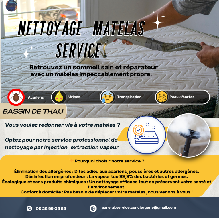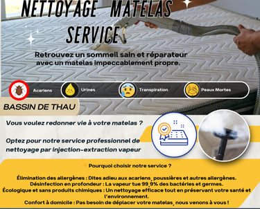 Nous sommes spécialisés dans le nettoyage de matelas par injection-extraction vapeur à domicile. Grâce à notre technologie de pointe, nous éliminons efficacement les poussières, les acariens et les allergènes, assurant un environnement de sommeil sain et confortable. Que vous soyez un particulier ou un professionnel (hôtel, auberge, etc.), nous offrons des services adaptés à vos besoins, profitez de notre expertise pour redonner vie à vos matelas et améliorer la qualité de votre sommeil. Contactez-nous pour un devis gratuit !